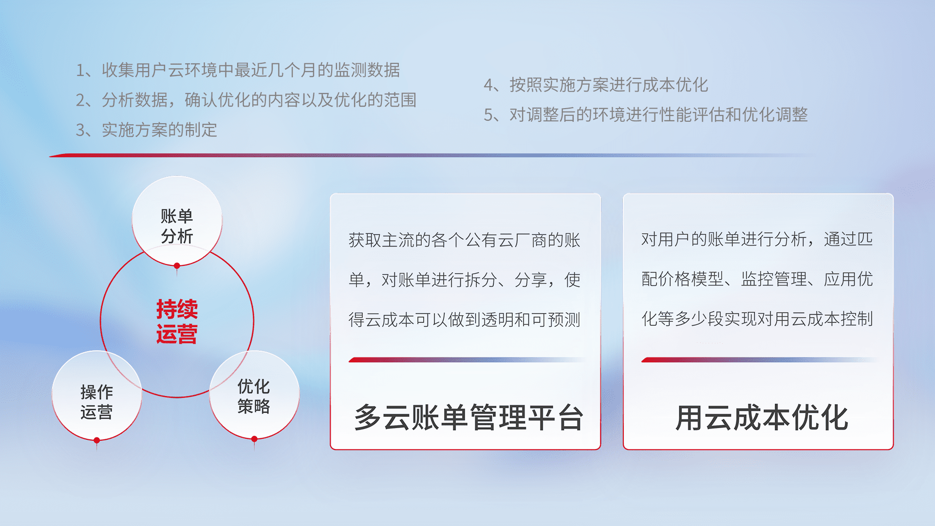 通过多云纳管,,以统一的资源数据模型把客户的云资源进行抽象和封装,,,进而实现对多云资源的统一操作,,,,保障云资源管理的可靠性、、、、稳定性与可用性。。。量身定制化运维内容,,,配置、、、开发运维、、、补丁管理、、、、备份、、监控、、、认证和访问管理、、、审计和日常巡检等,,保障在用云过程中的可靠度,,稳定度以及高可用率。。。。